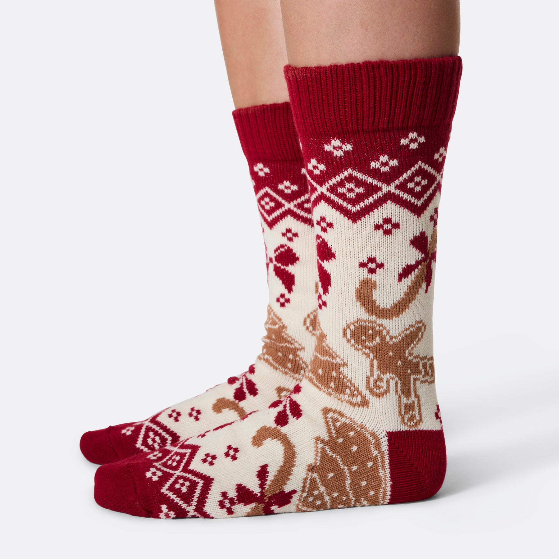 Tykke strikkede sokker med festlige nordiske mønstre og tradisjonelle julemotiv i koselige vinterfarger. Disse vakre midt-på-leggen sokkene holder bena varme og julestemningen høy – perfekt til kvelder ved peisen eller som den ultimate julegaven til sokka!