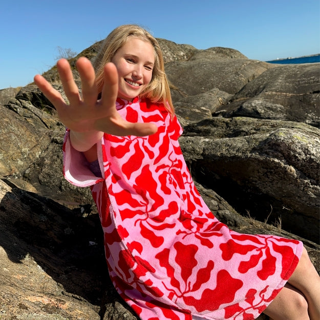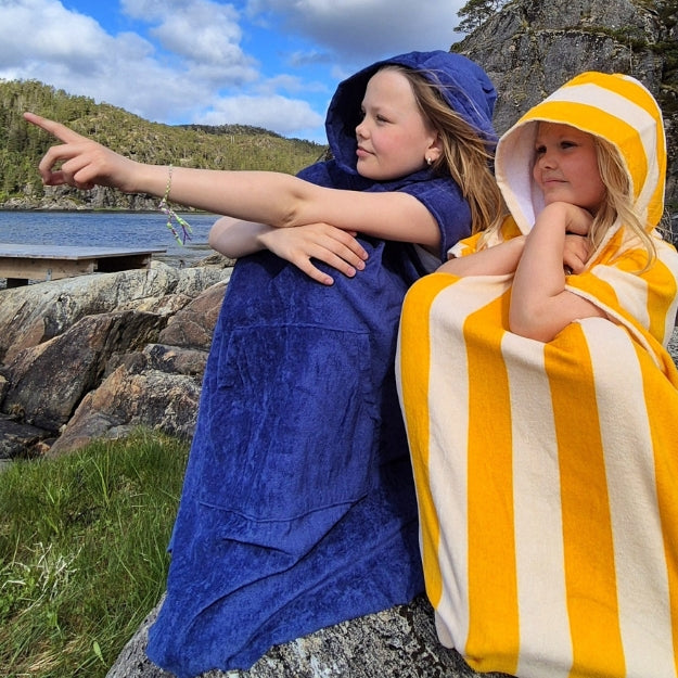 Badeponchoen er laget av 100% bomull og blir raskt ditt nye favorittplagg i sommer.