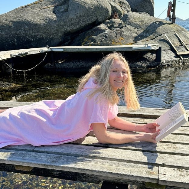 Perfekt å ta på seg etter badeturen! Så god og myk, og friske farger. Folk blir alltid så misunnelig når jeg tar den på meg etter å ha badet 💛🤍☀️